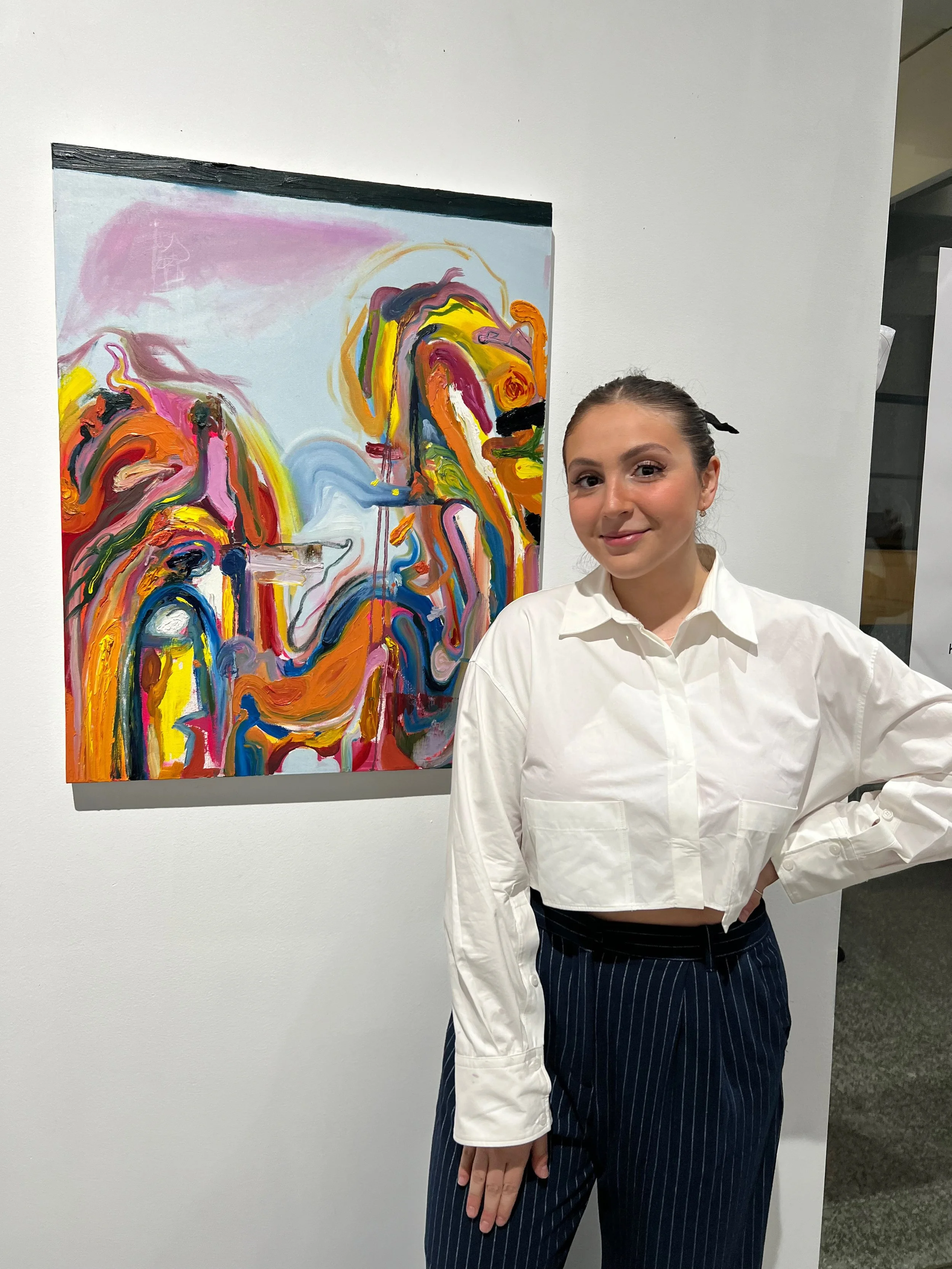 Marina Doukas is a Canadian painter known for her dynamic, colourful works that balance vibrant energy with introspective depth. Her paintings range from bold and chaotic to more controlled, blended compositions, reflecting the complexities of self-expression and the nuances of identity. By bringing together abstract mark-making and contemporary portraiture, she delves into themes of perception, individuality, and the multifaceted nature of the self. Drawing from her expertise in gesture and abstraction, she uses paint as both a tool and a medium to document her journey of self-discovery, capturing moments of tension, revelation, and the pursuit of authenticity. Through a vivid palette and varied brushwork, her art serves as a continuous exploration of personal truth, celebrating the assertiveness and vulnerability inherent in the human experience.